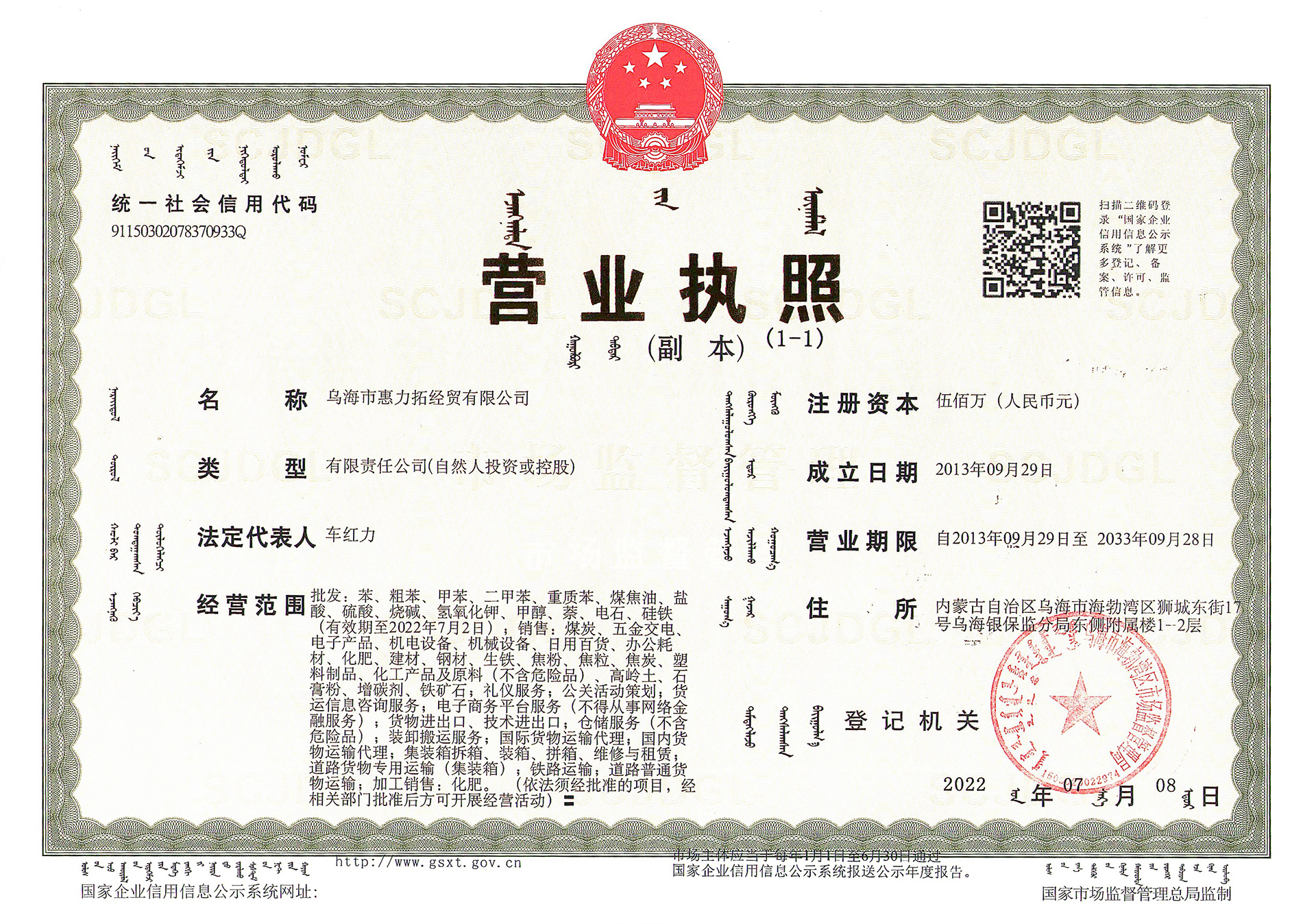 中華全國工商業(yè)聯(lián)合會石油業(yè)商會 會長單位 烏海市惠力拓商貿(mào)有限公司